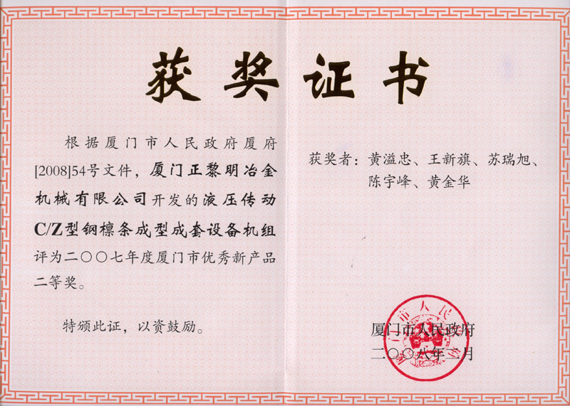 CZ型钢檩条成型机组优秀新产品二等奖
