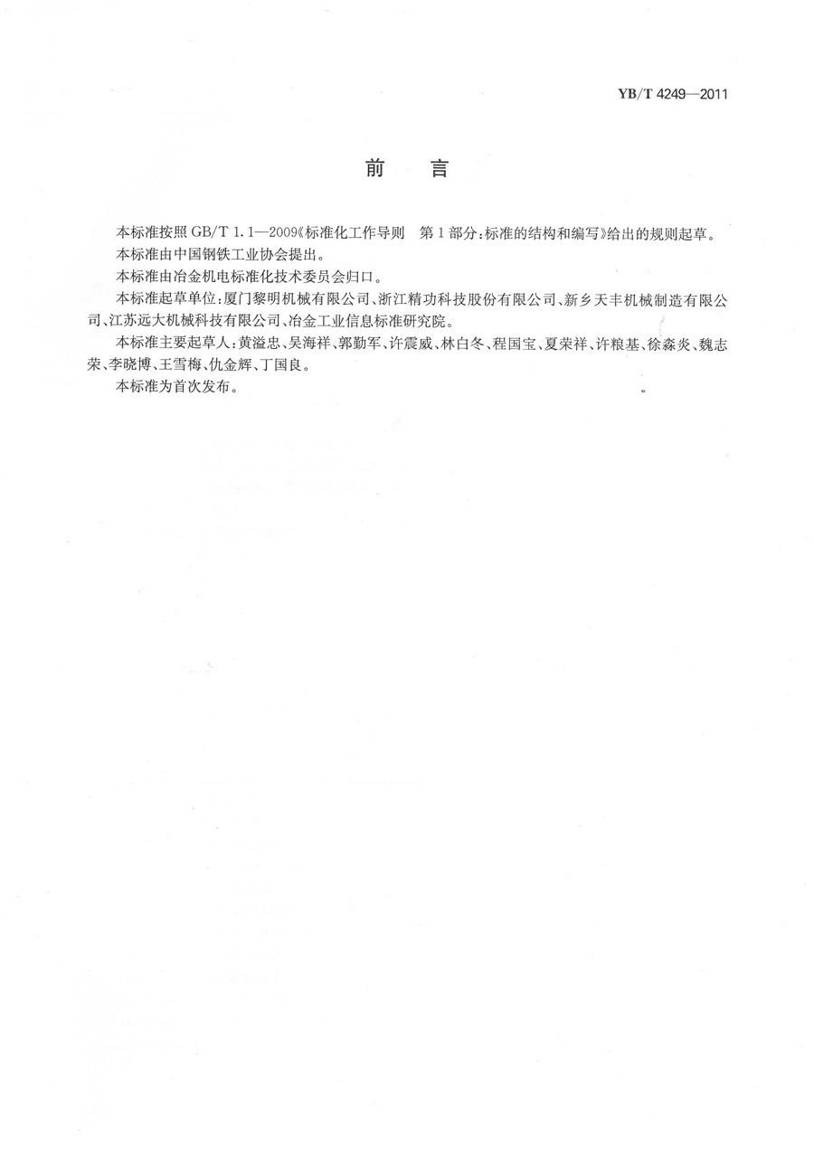 由厦门黎明机械有限公司、浙江精功科技股份有限公司、新乡天丰机械制造有限公司、江苏远大机械科技有限公司、冶金工业信息标准研究院等五家标准起草单位联合起草的中华人民共和国黑色冶金行业标准YB/T4249-2011《压型钢板机组技术要求》,于2011年12月20日正式发布。2012年7月1日开始实施。全国锻压机械标准化技术委员会辊式冷轧成型设备工作组(SAC/TC220/WG4)组长黄溢忠同志是第一起草人,组员程国宝参与标准起草。